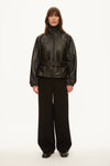Leather jacket with wait belt. Made from 100% lamb leather. Features hip-length structured silhouette, collar covering the neck when fully zipped, balloon sleeves with elasticized cuffs, wide belt with silver hardware, paneled construction, vertical zip pockets, and full front zip. Relaxed fit.