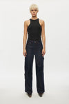 Basic ribbed tank top. Made in a tight, stretchy nylon rib. Featuring a round neck, deep-cut armholes and racer back. Contrast flatlock stitching at neckline and bottom hem. Tight fit.
