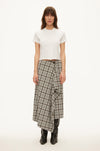 Checked midi skirt. Made from a soft, lightweight stretch blend. Straight, pencil-inspired silhouette with a clean waistband. Overlapping front with a side button at the waistband. Asymmetric hem with a cascading draped panel. Relaxed, straight fit.