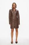 Short leather dress. Made in soft and smooth leather with tonal stitching. Featuring a collar and two-way-zip closure and long sleeves. Fitted seams at front and back. Short, slim silhouette.