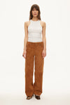 Leather trousers. Made from 100% lamb suede with smooth lining. Features straight wide-leg silhouette, high-rise waistband, flat front, curved front pockets, tonal topstitching, paneled knee seams, discreet silver hardware with D-ring accent. Full-length.