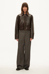Cropped leather bomber jacket. Made from 100% lamb leather with a subtle burnished sheen. Features a cropped, boxy silhouette with dropped shoulders, a pointed collar, a full-length metal zip, zippered welt pockets, zip cuffs, and a wide rib-knit waistband. Relaxed, boxy fit.