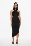Dress with bare shoulders. Made in a soft and stretchy fabric. Featuring an elastic hem around the bust. Wide section of fabric attached at sides that can be styled as a hood or pulled down over shoulders. Gathered seams at sides. Asymmetric hem. Tight fit.