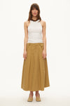 Woven midi skirt. Made from 100% cotton. Features A-line silhouette, high waist, flared cut, tailored panel seams, inverted box pleats front and back, slanted hip pockets, fixed waistband with belt loops, concealed fly. Relxaed, wide fit.