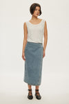 Wrap-over denim skirt. Made in cotton denim with ice-blue wash and contrast stretching. Featuring a concealed press stud inside waistband and a large silver eyelet with tie belt with metal buckle. Fitted seams at back. Slim and straight fit.