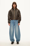 Vintage-look leather bomber jacket. Made in smooth leather with vintage effect. Featuring a chunky metal zip fastening at the front, one zip pocket on one sleeve and two flap pockets at the front. Dropped shoulders. Elasticated ribbed cuffs and bottom hem. Fully lined. Short and relaxed fit.