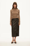 Crossover leather skirt. Made in soft and smooth leather with tonal stitching. Featuring a concealed button fastening at inside of waist and crossover flap that fastens with metal ring and leather strap and buckle at one side. Fully lined. Regular fit with straight silhouette.